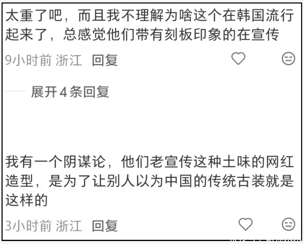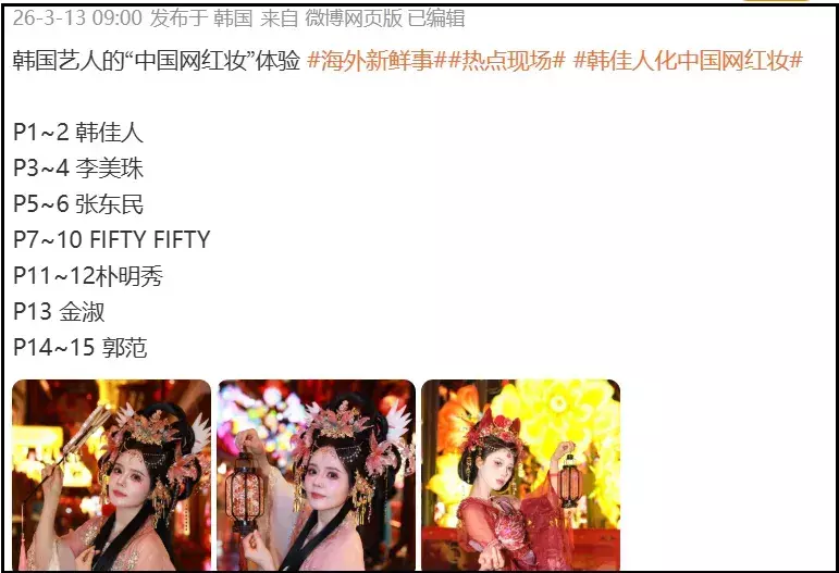 另外,网友还注意到,明明各大景区都可以选择更好看的复原妆,韩星偏偏要选择更夸张的网红妆,其他韩星可能是为了综艺效果,但韩佳人不一样。