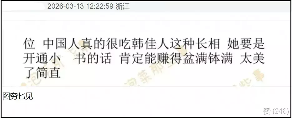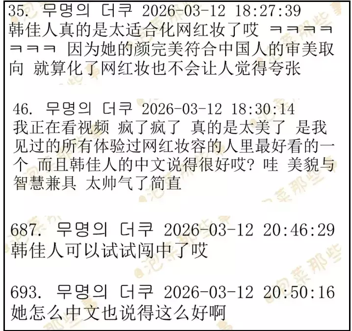 有网友翻出韩网所谓讨论韩佳人化中国网红妆的热帖,评论区一水夸她符合中国人审美,还让她去中国发展、拍中国古装剧。
