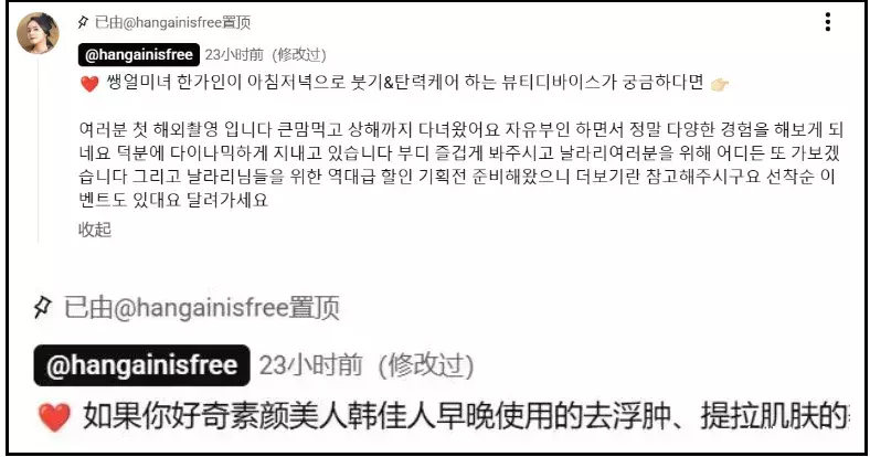 韩佳人化中国网红妆的动态评论区,还有她本人亲自置顶的购买链接呢,平台都标注含有付费内容,不会真有人信了韩佳人是因为热爱中国文化才拍摄的吧?