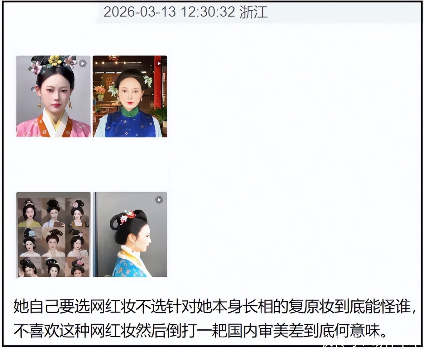 抛开争议不提,韩佳人状态还是很好的,不需要网红妆修饰,完全可以尝试真正的中国古代妆容,为什么不化呢?是审美受限,还是想把网红妆和中国挂钩,方便韩国继续偷中式妆容……